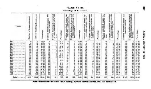 There was a lot of success with treating psychiatric patients with homeopathy. Patients left this hospital cured or well enough to be discharged. Some stayed for weeks, months or even years. Some patients never left the hospital. At the time the homeopathic psychiatric hospitals existed they believed that dementia was a mental illness (8). So when we look at statistics of the hospital we need to keep in mind that dementia patients were classed as having a mental illness. Statistics of the Middletown State Homeopathic Hospital show that many patients who were treated for psychiatric illnesses were discharged as recovered. Table 23 of the Middletown 25th Annual Report (below) shows that the average percentage of patients discharged as recovered over a 21 year period from 1874-1895 was 36.45%. The same chart demonstrates that the rate of recovery was even higher for patients who were admitted within six months of developing the symptoms of mental illness. Those who sought treatment within six months of getting symptoms had an average recovery rate of 50.06%, whereas those who had their mental illness for more than five years had lower average recovery rate at 7.97% (8).